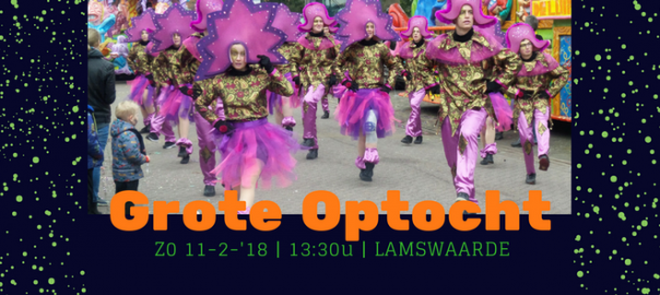 Op de Verkensmart zal carnaval in Lamsorenland geopend worden door Prins Denniekes, samen met burgemeester Mulder. Daarna starten we met de traditionele stoet. Deze loopt vanaf de P&P-hoeve naar de Frederik Hendrikstraat, Abeeledreefken, Hoefkensdijk en weer terug door de Dreef. De eerste prijs is het carnavaleske bedrag van €555,-. Dè optocht van de carnavalszondag: vorig jaar reden er heel wat wagens mee, dus komt dat zien!